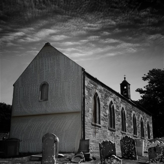 Kinneff Church is open to the public and there are information boards that tell the story. Perched on top of the alter is an old Scottish Bible. When I saw the bible, I immediately thought about Dunnottar Castle and how it too is perched high up. I used this concept to create my final picture, taking words from the pages of the Bible that sits on the alter of the church, and incorporating the words into my image. The broken headstones add to the idea of ‘something hidden below ground’.